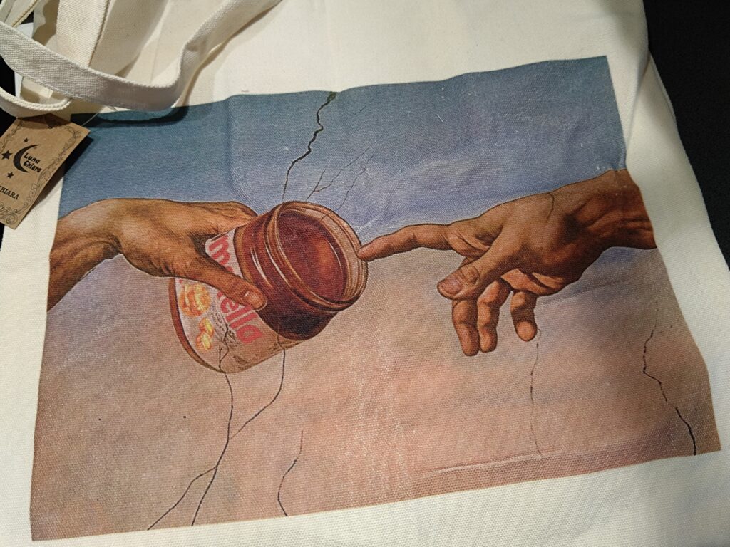 ↑↑の 【アダムの創造】(ミケランジェロ作)のパロディトートは、