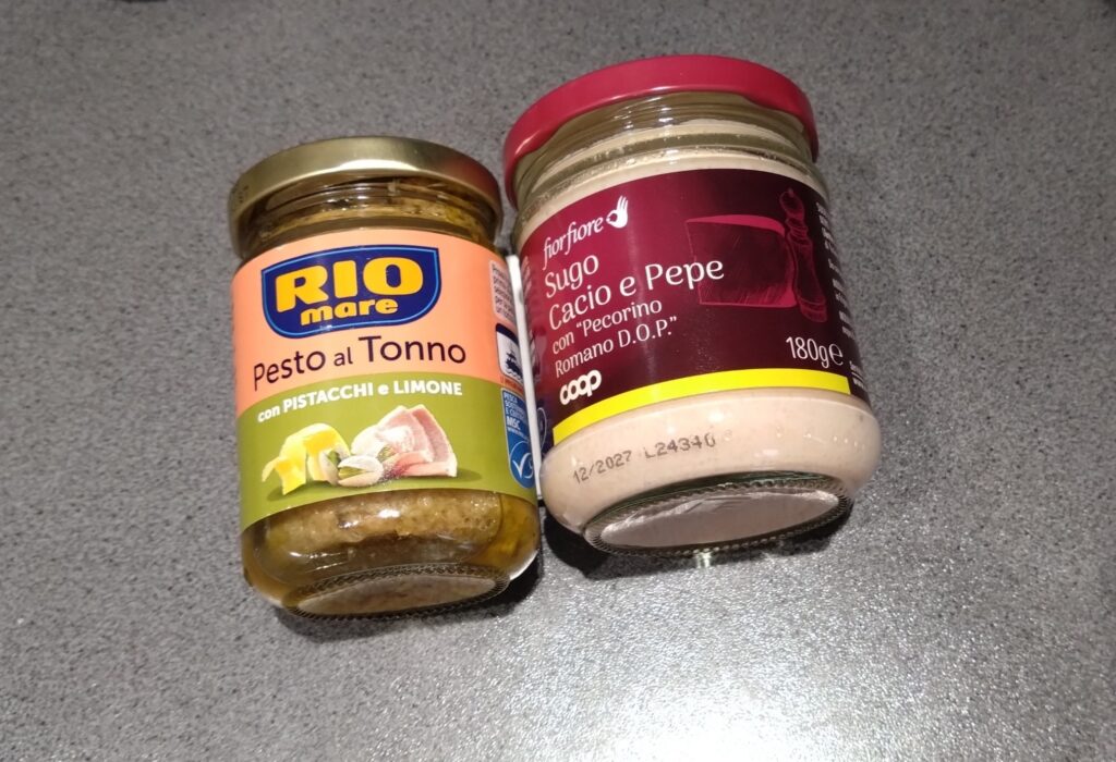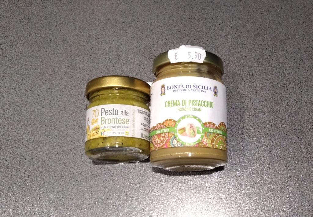 左側が ピスタチオのパスタソース (ミニサイズ 2,90€)、
